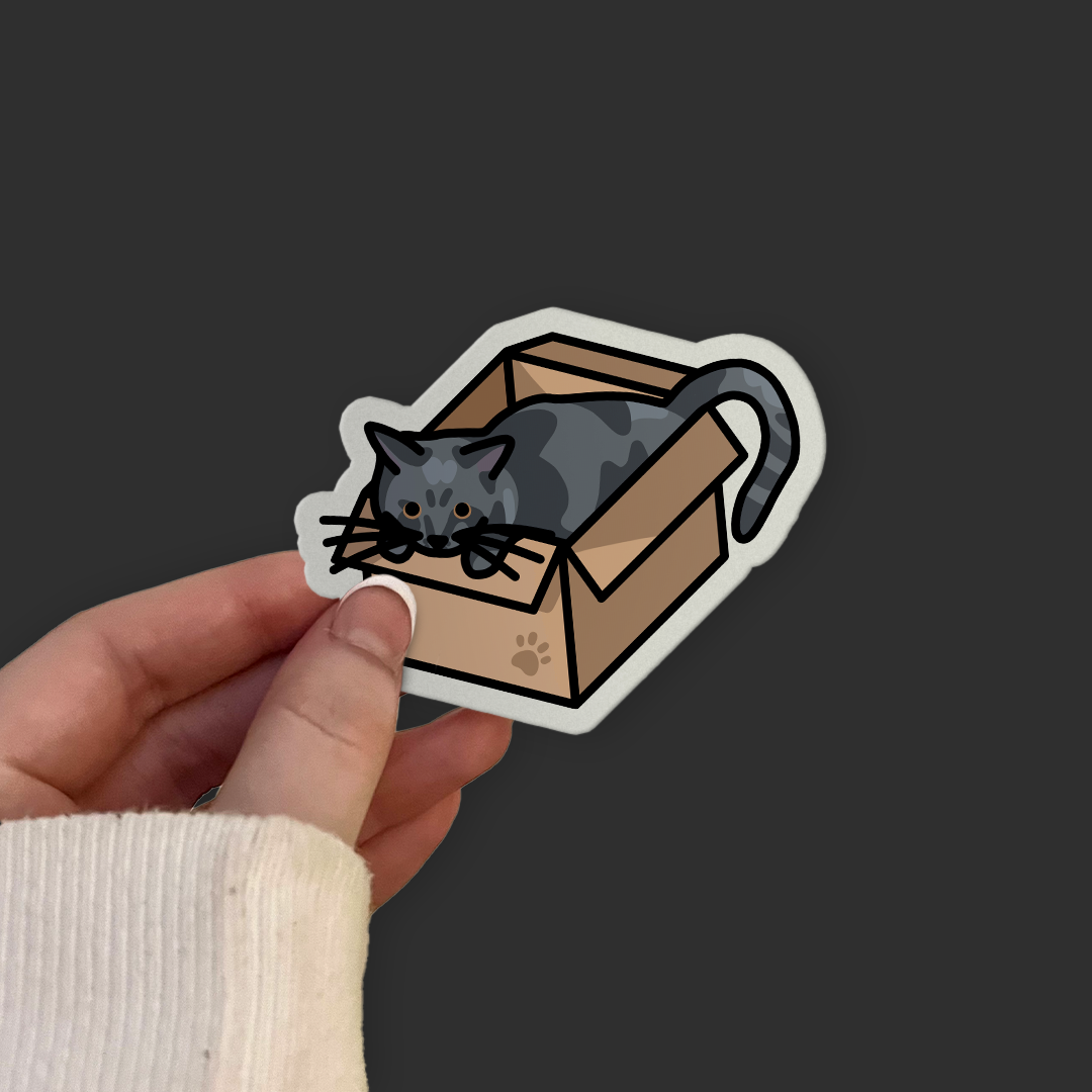 Gift For Cat Lovers. A sticker of a grey/blue british shorthair cat in one of their favourite places: a cardboard box!. Perfect for journalling, sticking on your laptop, or putting in your phone case.