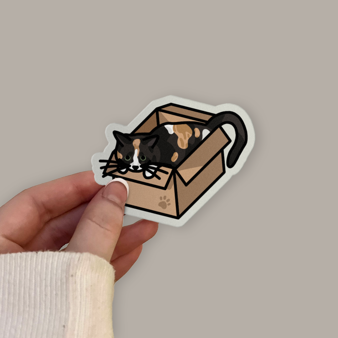Gift For Cat Lovers. A sticker of a ginger, white and black calico cat in one of their favourite places: a cardboard box!. Perfect for journalling, sticking on your laptop, or putting in your phone case.