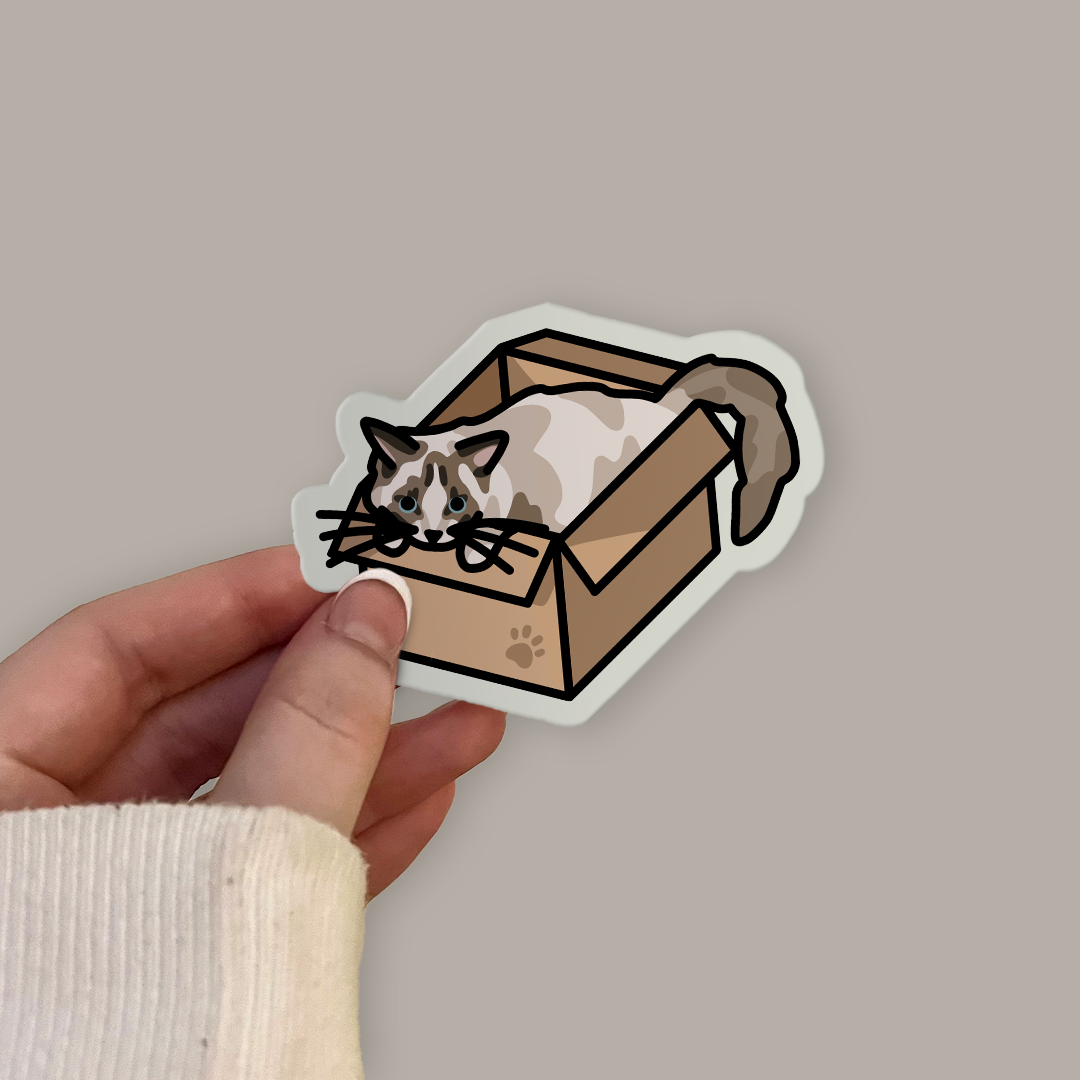 Gift For Cat Lovers. A sticker of a ragdoll cat in one of their favourite places: a cardboard box!. Perfect for journalling, sticking on your laptop, or putting in your phone case.